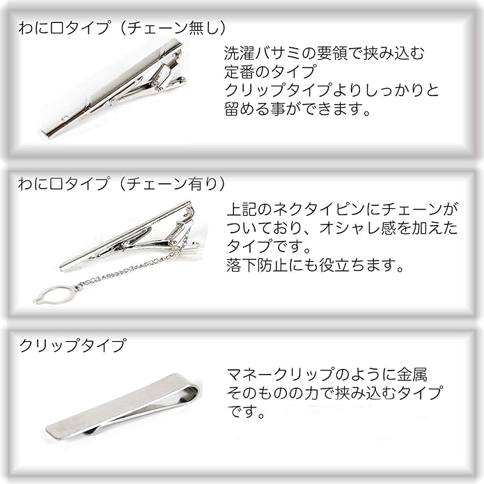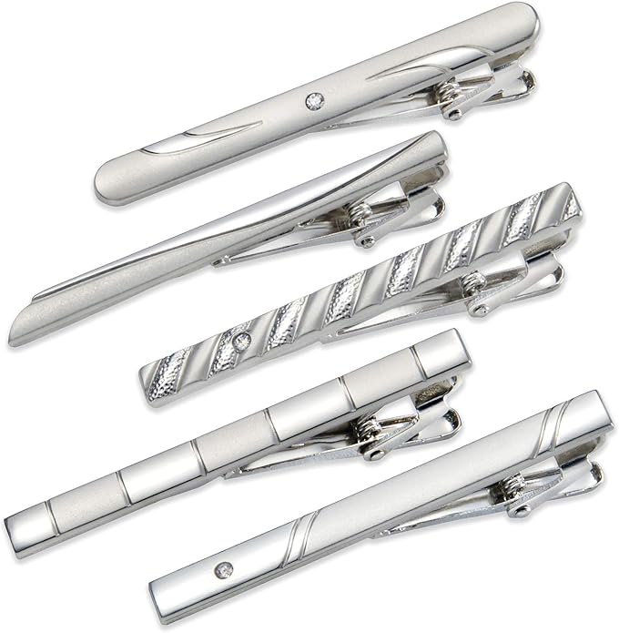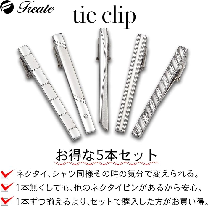 【男性用の紳士小物】お洒落なタイピン5個セットです。付け方はネクタイに挟むだけ。スーツスタイルに個性を出すことができます。カフスボタン、ポケットチーフ、カラーピンなどと組み合わせると、より華やかさを演出できます。