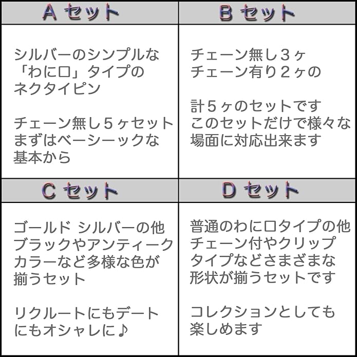 【多種多様なデザイン】人気のシンプルな物を中心に取り揃えております。色はシルバー、ゴールド、ブラックなど。デザインは短いショートタイプの物から、チェーン付き、クリップタイプのものまで、お好みのセットをお選びください。