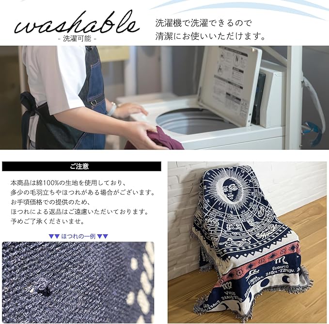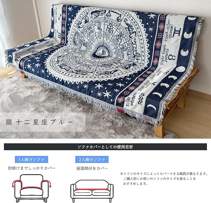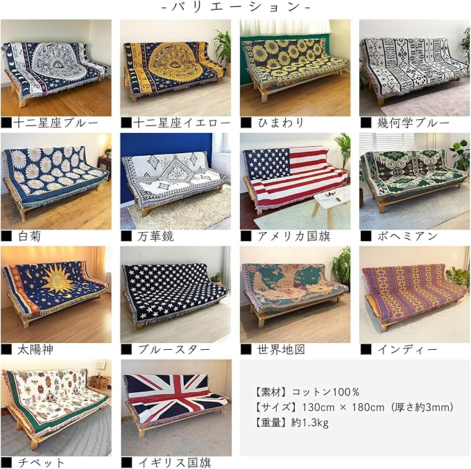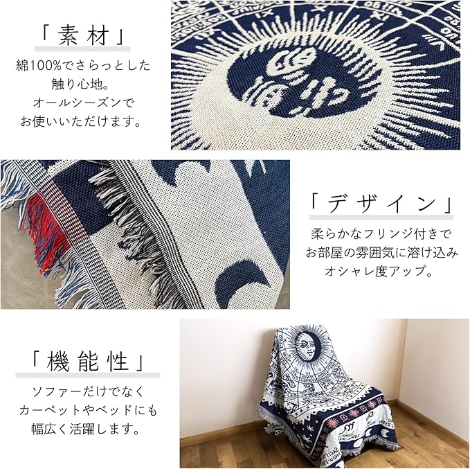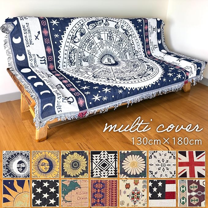北欧デザインのマルチカバーは、太陽柄、星条旗、星座模様など多彩なバリエーションを揃えています。お部屋の雰囲気を変えるアイテムとして最適で、シンプルなインテリアにも馴染みます。サイズは130 180cmで、ソファーカバーやベッドカバー、こたつ掛けカバーなど幅広い用途に対応します。