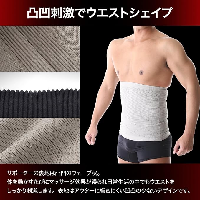 裏地は凸凹ウェーブ状で、体を動かすたびにウエストをしっかり刺激します。表地はアウターに響きにくい凹凸の少ないデザイン。