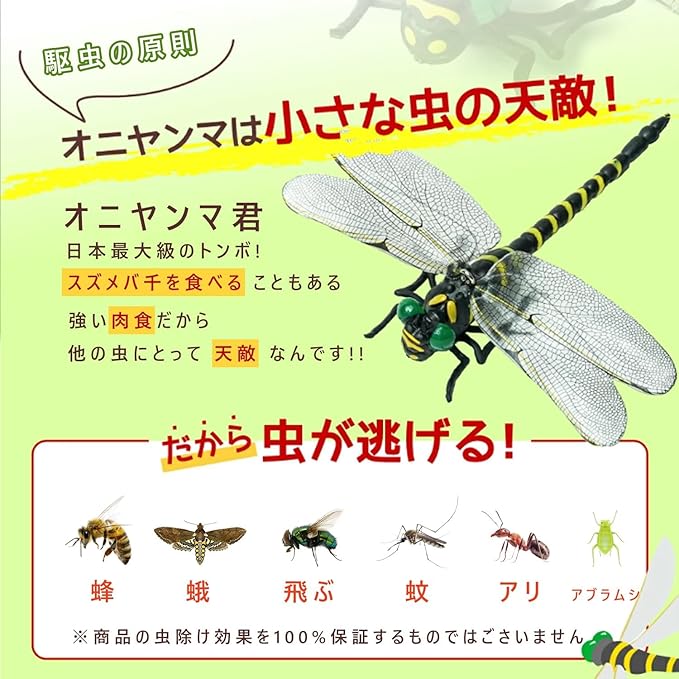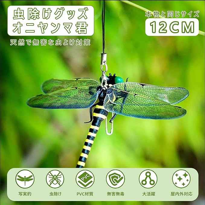 【2025年モデル・オニヤンマ 虫除け】この虫よけトンボは殺虫剤、忌避剤、電気やガスを使わないSNSやテレビで話題沸騰になる虫避けグッズになります。ミツバチ、蚊、スズメバチ、蝶、蛾類、アブ、バッタ、カマキリ、ハエなどの昆虫に対して優れた警告で反発効果を発揮します。家やアウトドア活動をより快適で安全にします。トンボの天敵機能と警戒色を利用し、昆虫を適度な距離で保ちます。
