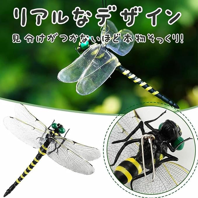【精巧な作りで超リアル】屋外で飛んでいる虫の天敵のリアルな模型です。翼幅約12cm、身長約11cm、高さ2.5cmです。ディテールにこだわった美しいフィギュア。緑色の鮮やかな眼や大きな羽が印象的。虫除けとしてはもちろん、インテリアやコレクションにもお勧めです。特に蚊に対してはボウフラと成虫の両方を捕食するため天敵となっています.『黒 黄』の組み合わせのカラーは自然界の警戒色なので効果抜群です。