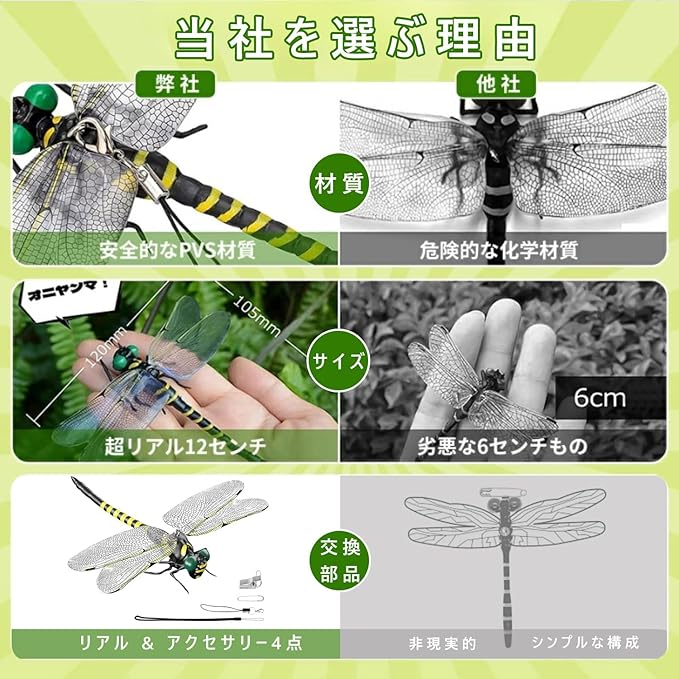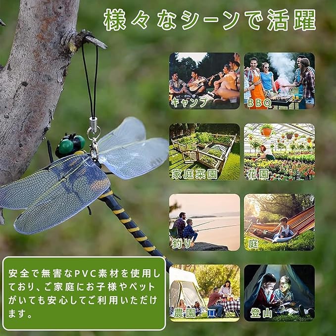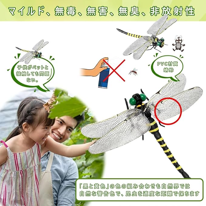 【耐久性強化のPVC素材を採用】 当社の虫除けトンボ、強靭で耐久性に優れた安全なPVC素材を。触りやすく使いやすい素材。リアルな色彩で手描きされ、繊細なデザインで視覚的と触覚的な魅力を高めています。長い寿命を持っています。防水防湿、防虫、私たちが日常的に見ているプラスチックとは異なり、PVCには難燃性断熱の特徴がある。PVC材料は安定した物理化学的性質を持ち、水、.、.に溶けず、ガス、子供がペットと接触しても問題ない。