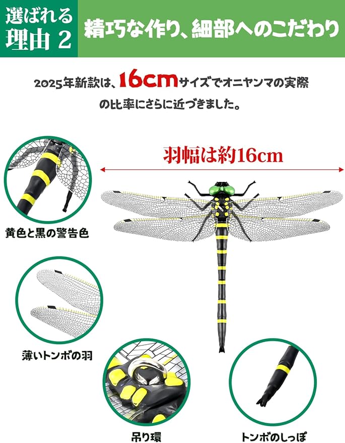 【本物に忠実なデザイン】オニヤンマは、外観と細部において本物のオニヤンマを精密に再現しています。羽の幅は約16cm、長さは約11cmで、手彩色で塗装された完成品です。リアルなサイズ、色、構造が、まるで本物のオニヤンマが目の前にいるかのような印象を与えます。