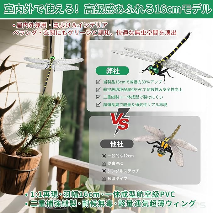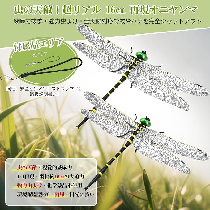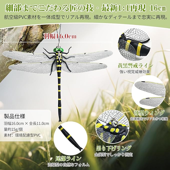 【2025年モデル・オニヤンマ 虫除け】屋外で飛んでいる虫の天敵のリアルな模型です。翼幅約16cm、身長約11cm、高さ2.5cmです。ディテールにこだわった美しいフィギュア。緑色の鮮やかな眼や大きな羽が印象的。虫除けとしてはもちろん、インテリアやコレクションにもお勧めです。特に蚊に対してはボウフラと成虫の両方を捕食するため天敵となっています.『黒 黄』の組み合わせのカラーは自然界の警戒色なので効果抜群です。