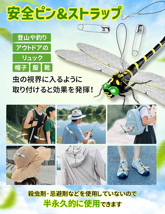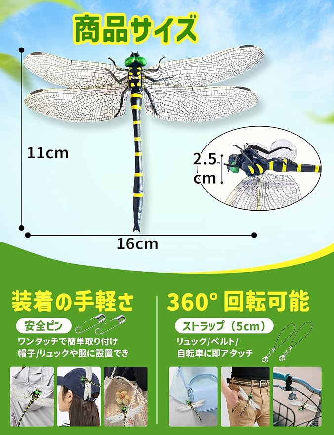 【耐久性UPの新構造デザイン】従来比50%耐衝撃の薄型PVC羽を採用!オニヤンマ君 虫除けは、外観と細部において本物のオニヤンマを精密に再現しています。 リアルなサイズ、色、構造が、まるで本物のオニヤンマが目の前にいるかのような印象を与えます。一体化成型設計、登山リュックへの衝撃や強風下でも破損リスクを低減。軽量化したで、アウトドア初心者でもストレスなく携行できます。