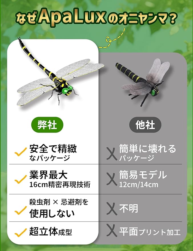 【オニヤンマ君 圧倒的な虫除け効果】16cmのリアルサイズが昆虫の視覚を刺激!本物と見紛うオニヤンマモデルが、蚊・ハチ・ハエ・蝶々・蛾・バッタ・カマキリなど15種以上の害虫を自然に忌避。2025年改良版では「黒 黄」の警戒色を強化し、殺虫剤不使用で子供が触れる庭遊びやベランダ作業にも最適です。特に蚊に対しては優れた効果を発揮し、アウトドア活動や家庭での虫除けに最適です。