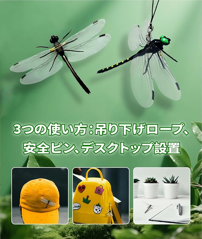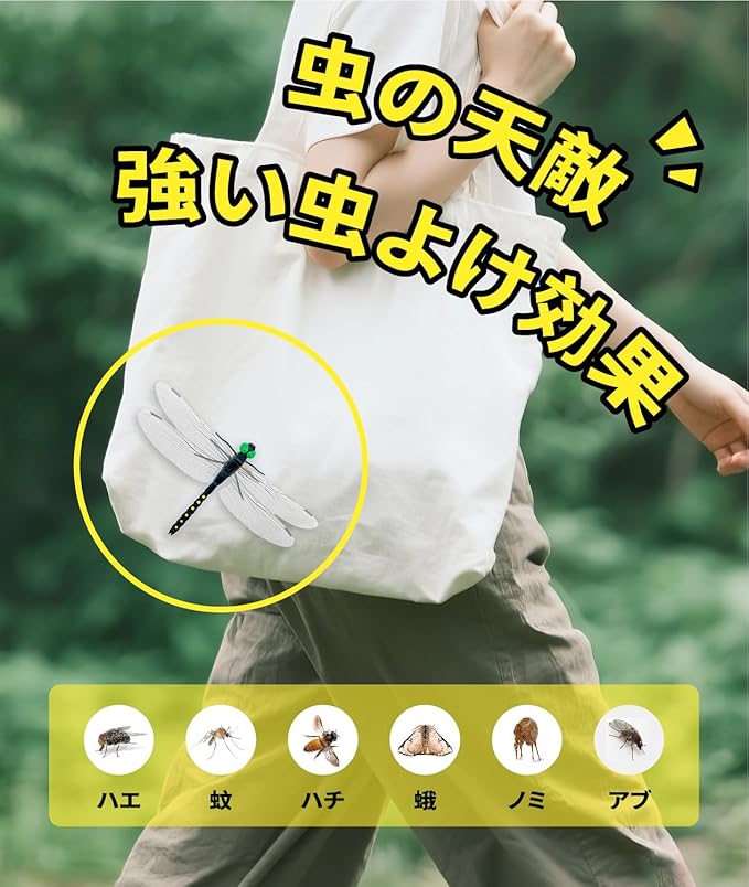 【使い方】当社の虫除けトンボには吊り下げロープと安全ピンが付属しており、さまざまな場所で使用できて便利です。衣服、帽子、リュック、ベビーカーなど、さまざまな場所に取り付けることができます。美しい装飾であるだけでなく、効果的な蚊よけとしても活躍します。