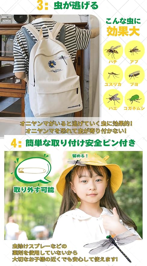 【リアルなオニヤンマ模型】付けるだけで虫除けになるオニヤンマフィギュアです。見分けがつかないほど本物そっくり!すぐ使える安全ピン付きます。