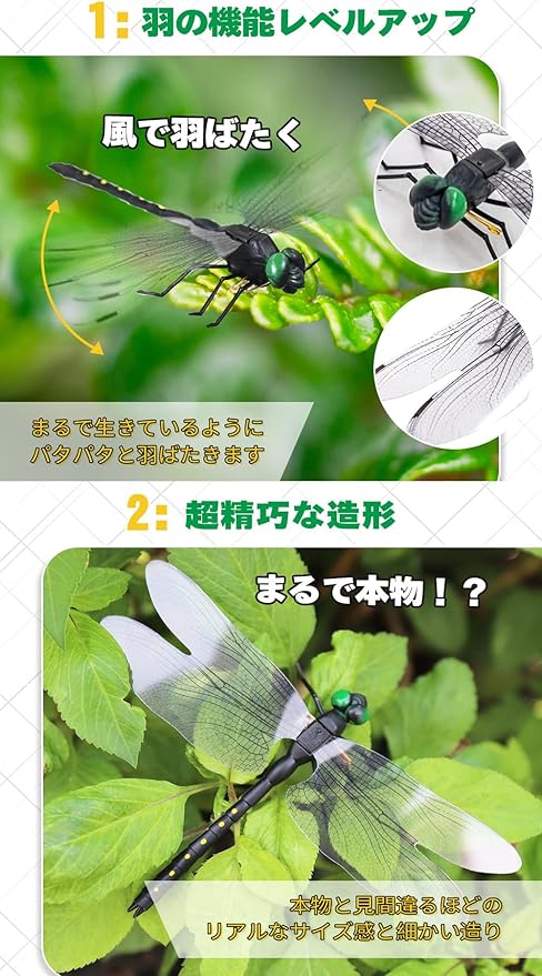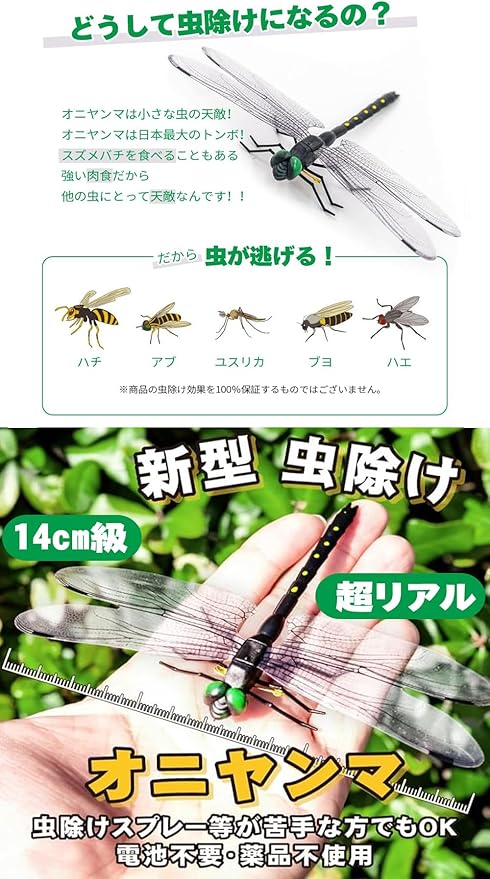 【本物そっくり】翼幅約14cm、全高約9.4cmとなります。緑色の鮮やかな眼や大きな羽が印象的、本っ物と同等サイズで仕上がりました。害虫たちにとって、まるで真の虫除けトンボ君が臨んでいます。