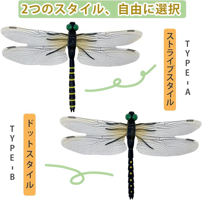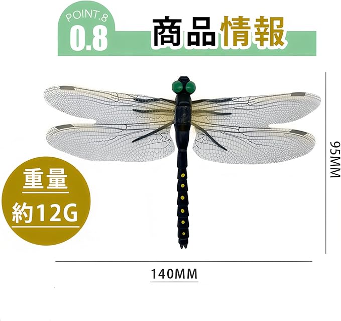 【自然にインスパイアされたデザイン】 自然界のトンボの形態を参考に開発された、リアルな虫除けモデルです。14cmのサイズで、羽や体のディテールを精密に表現し、虫が忌避する視覚効果を実現しました。