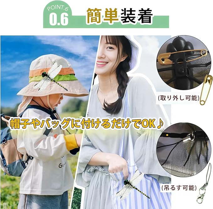 【使い方いろいろ簡単取付】安全ピンとストラップが付属しており、帽子・バッグ・洋服・ベビーカーなど様々なアイテムに簡単に取り付け可能。屋外活動の際に常に身に付けておくことで、虫を寄せ付けにくくします。
