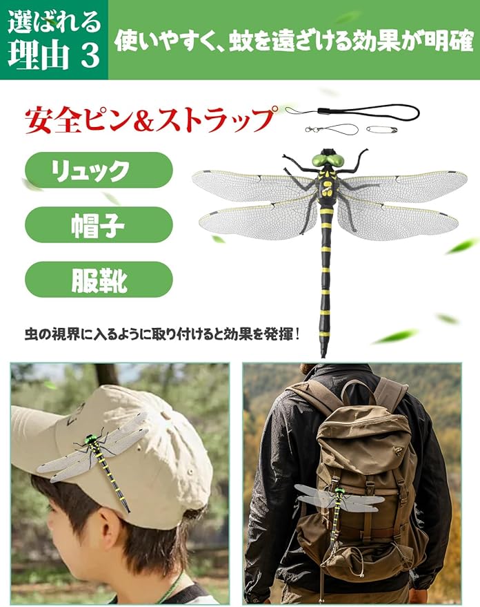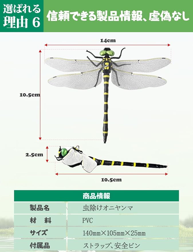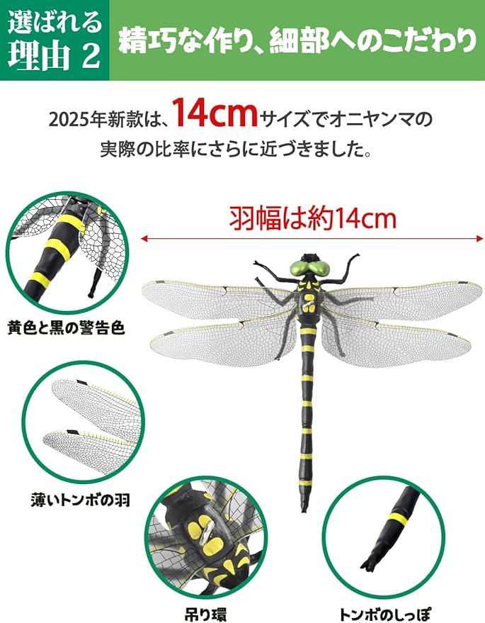 【驚異的な虫除け効果】オニヤンマは自然界で蚊やハチなどの害虫を捕食するため、視覚的な威嚇効果があります。2025年モデルは、実物に近いサイズや色合いを再現し、自然の力を模したデザインで虫除け効果を最大限に引き出します。