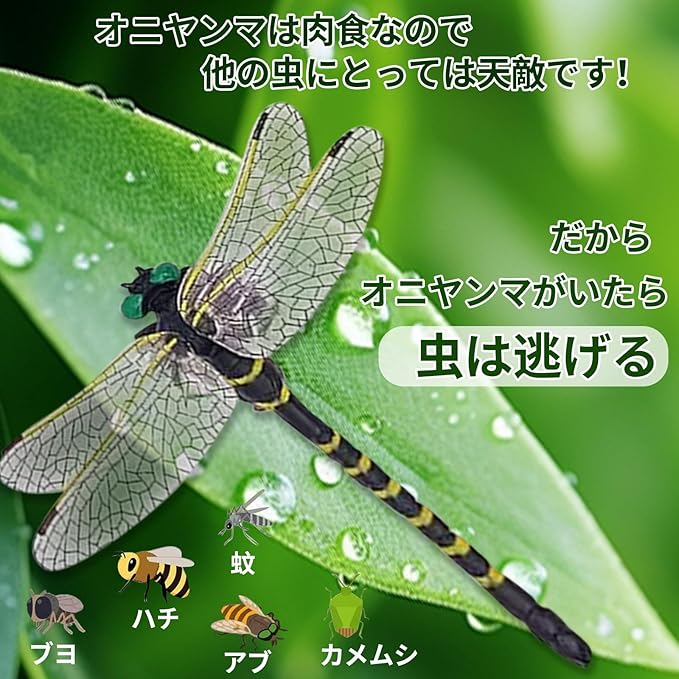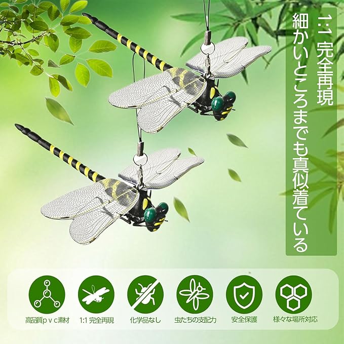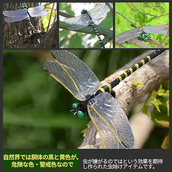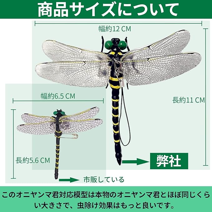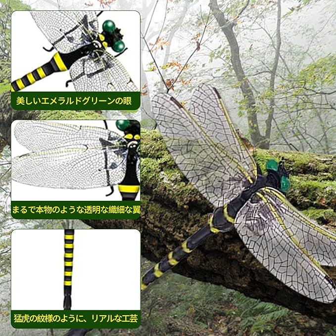 【1:1完全再現】.は細かい所までも逃さず、虫除けトンボ君に1:1完全再現させます。6cmの小さいオニヤンマ君に比べて、当社のサイズはもっと大きくて、このオニヤンマ君対応モデルは本物のオニヤンマ君と同じくらい大きくて、虫除け効果が高いです。害虫たちにとって、まるで真の虫除けトンボ君が臨んでいる。