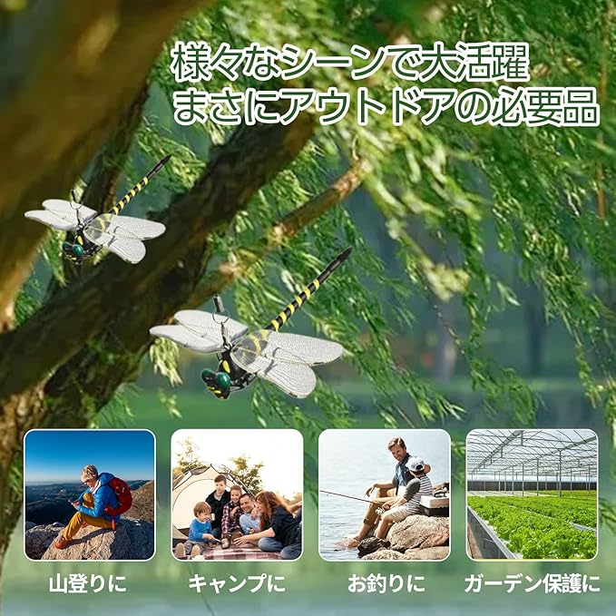【安全ピンとストラップ付属】安全ピンやストラップを使って、アクセサリーと同じように身に着け、あるいは帽子や鞄などに固定できます。野外で活動しても不意に紛失する心配はありません。【使用方法】防虫トンボモデルには、ストラップ、金属クリップ、安全ピンが付属しており、帽子やバックパックなどに取り付けるだけですぐに使用でき、虫を寄せ付けず、皮膚に刺されるのを防ぎます。