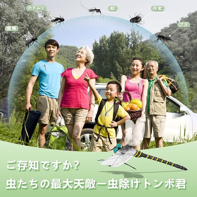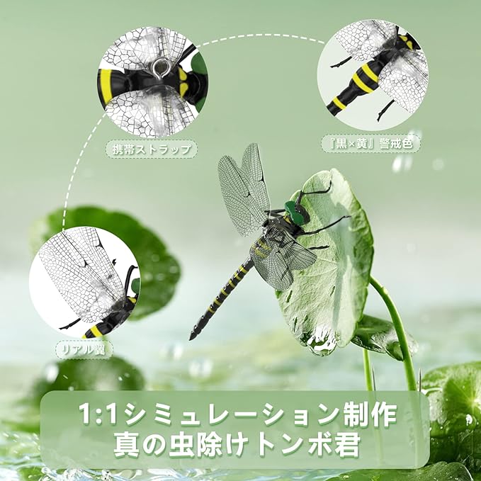 【虫避け対策】SNS話題になるトンボ君は安全で健康な虫除け対策だそうです。トンボの『黒 黄』の組み合わせのカラーは自然界の警戒色なので、虫たちに対してはボウフラと成虫の両方を捕食するため天敵となります。