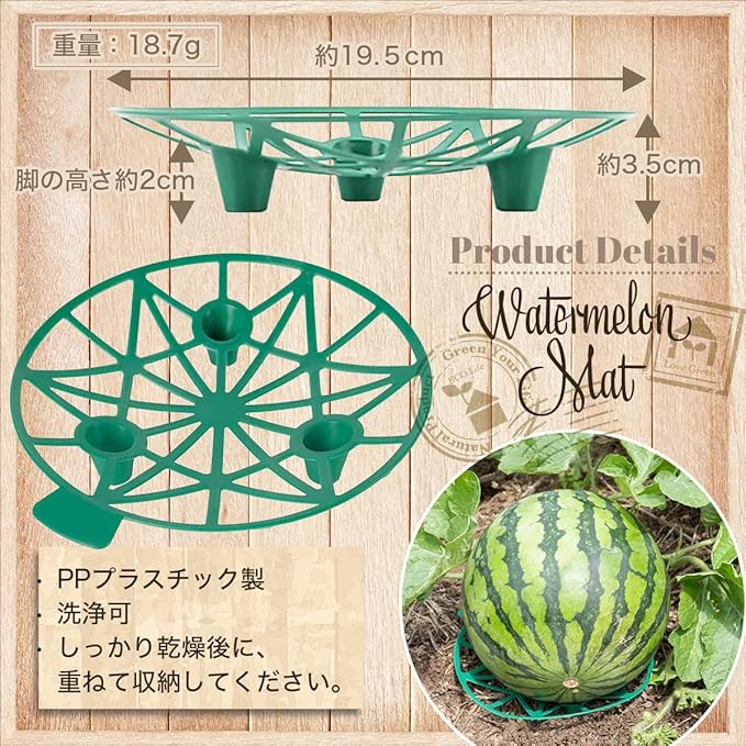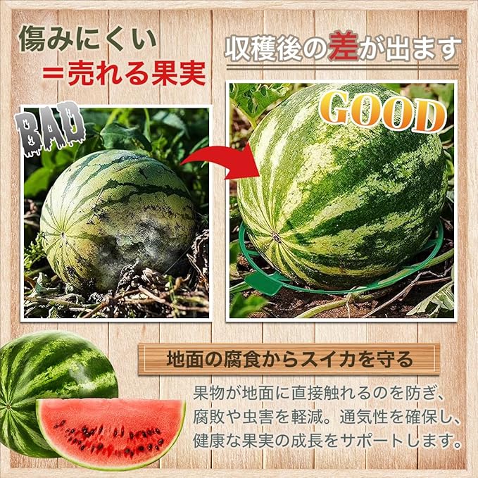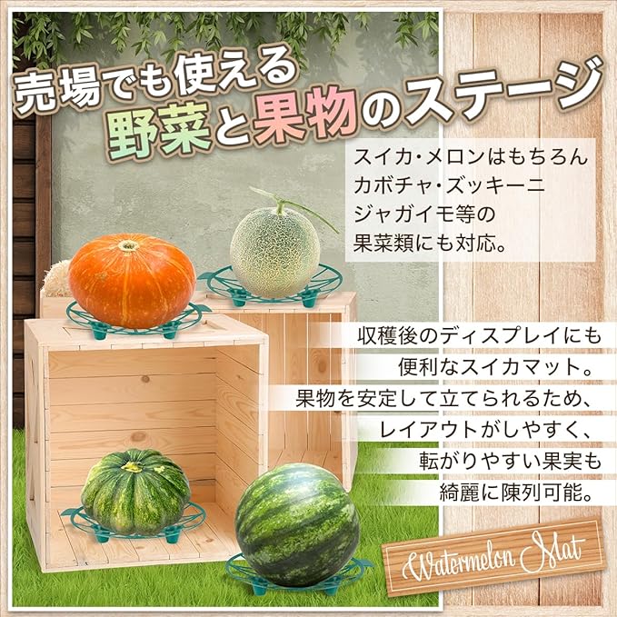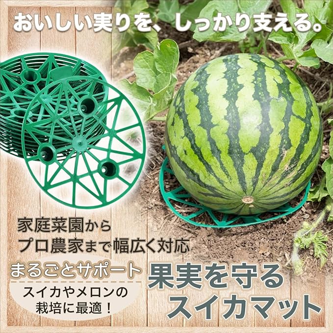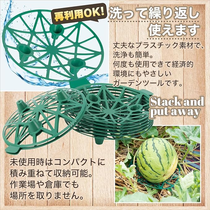 【果実をしっかり支える構造|安定サポート】 精密に計算された脚の角度配置により、果実の重さによる横揺れや沈み込みを抑え、安定して支えられます。スイカやカボチャなどの大型果実を地面から適度に持ち上げることで、果実の自然な発育を妨げず、土壌の湿気や泥汚れの影響からも守ることが可能です。プロの農家から家庭菜園の愛好者まで、誰でも安心して使える設計です。