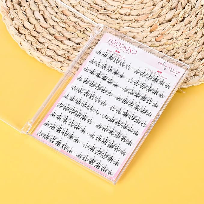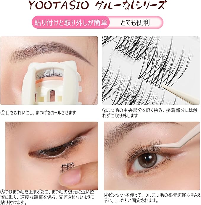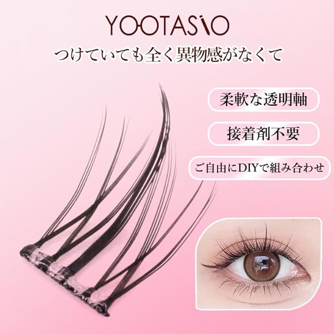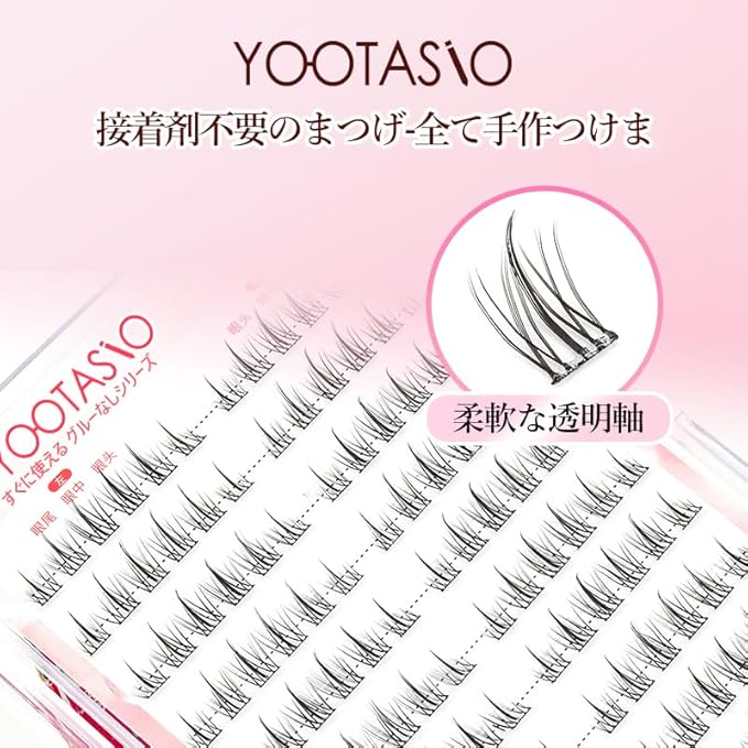 【柔軟な透明軸つけまつげ束感】YOOTASIOこのつけまつげは、アイドルグループのステージメイクからインスパイアされ、繊細な繊維とボリューム感で自然な束感を実現します。透明で柔軟な軸を採用しており、ナチュラルな見た目と快適な装着感で、日常使いから華やかな舞台メイクまで幅広く対応します。