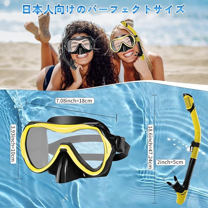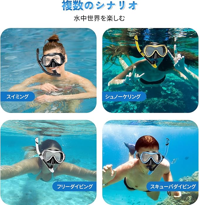 【シュノーケリング2点セット 初心者向け男女兼用デザイン】ダイビングとドライスノーケルの最適コンビ!シリコン製密着フィット構造で、日本人の顔型に沿った柔軟な密着性を実現。ストラップはワンタッチ調節式で、水中でもズレにくく簡単着脱が可能。潜水メガネと呼吸管のセットだから、シュノーケリングデビューに最適です。