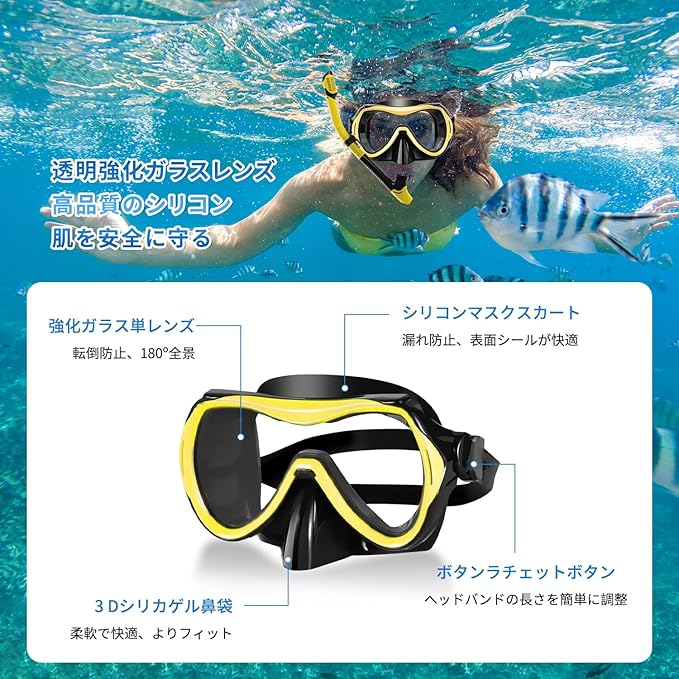 【強化ガラス/耐衝撃/耐圧設計 広視界&UVカット機能】潜水眼鏡のレンズは強化ガラス製で、耐圧・耐衝撃性能を備えた高耐久設計。プラスチックより3倍透明で歪みのない視界を確保。曇り止めクロスが付きなので、着装する前に、レンズに拭きなら、水の中に曇らないです。紫外線カット機能搭載でのお肌に、目にやさしいレンズです。