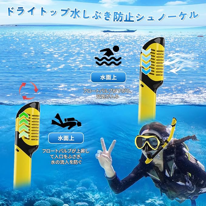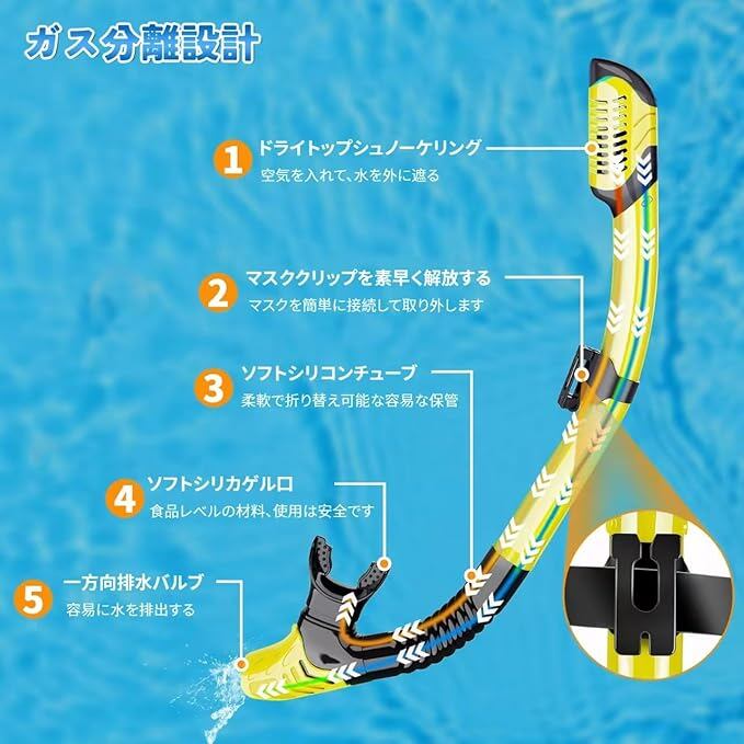 【ドライスノーケル 完全浸水防止テクノロジー】自動開閉バルブを採用したドライスノーケルは、潜水時に水の侵入をブロック。浮上時は瞬時に排気可能で、呼吸のストレスゼロ!シリコンマウスピースは顎に優しく、長時間のシュノーケリングセット使用でも疲労を軽減します。