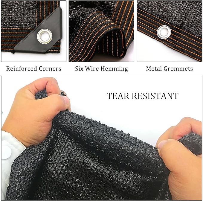 製品の詳細: 遮光ネットの縁は 6 本の糸で細かく縫い付けられ、四隅は黒いゴムの三角形のスリーブで補強されており、見た目が美しく、破れにくくなっています。ロープ付きの金属グロメット設計により、ネットをより速く設置できます。