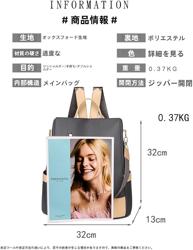 サイズ:32x32x13cm.重さ:約370gと軽量なので、ちょっとしたお出かけの際にはもちろん、A4サイズの収納も可能なので通勤通学にもご利用いただけます。