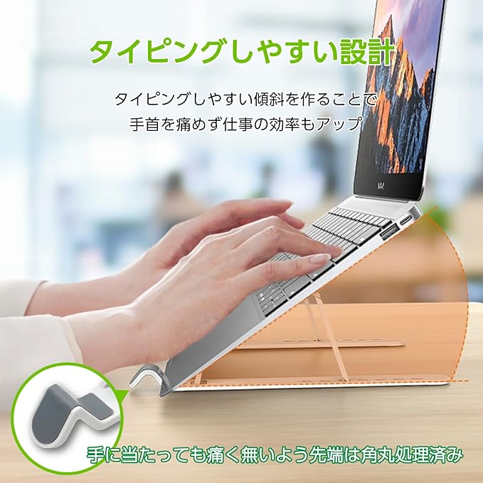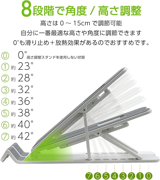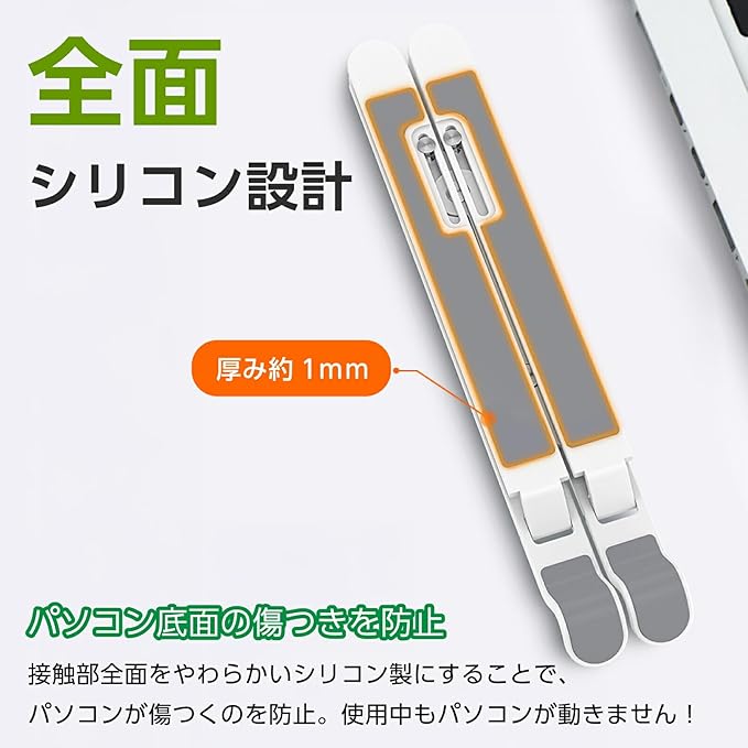 ・8段階高さ調節可能 角度を多段階で調節することができ利用状況に合わせることにより最適な姿勢でご使用いただくことができます。 ・フルシリコンで安定感強化+PCを傷つけにくい! 滑り止め部分を既存の4点ではなくすべてシリコンで覆いました 安定感はもちろんですが、パソコンやダブレットの背面を傷つけにくい仕様になっています。