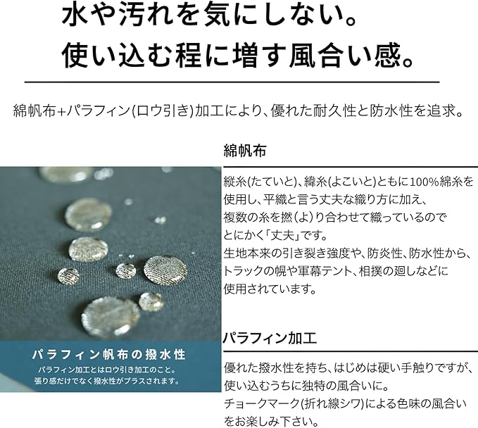 【パラフィン加工-(防水・超撥水)】パラフィンとは、ロウソクやクレヨンの原料にも使われる素材です。温めると液体になり常温では固体となります。生地に専用の固形パラフィンを熱で溶かして、沁み込ませる手法で加工されます。この加工により、生地に芯のある張り感が出て、撥水機能が付帯されます。 またパラフィン加工後にはバイオウォッシュ加工を施しています。セルロース(植物繊維の主成分)を分解するセルラーゼという酵素を使う加工を施すことで柔らかな風合いとなり、ヴィンテージ感のある生地となります。