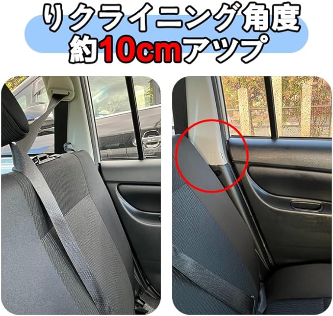 【角度調整】垂直に近い背もたれを左右の純正部品を交換することによりリクライニングの角度を約10センチアップすることが可能、長距離の移動を快適にします