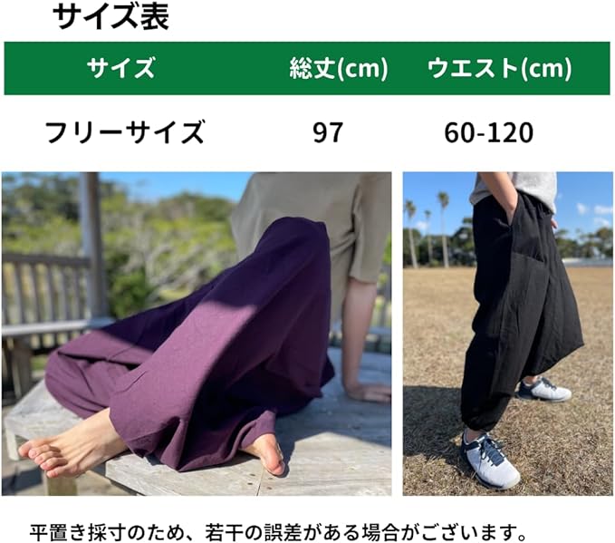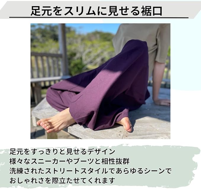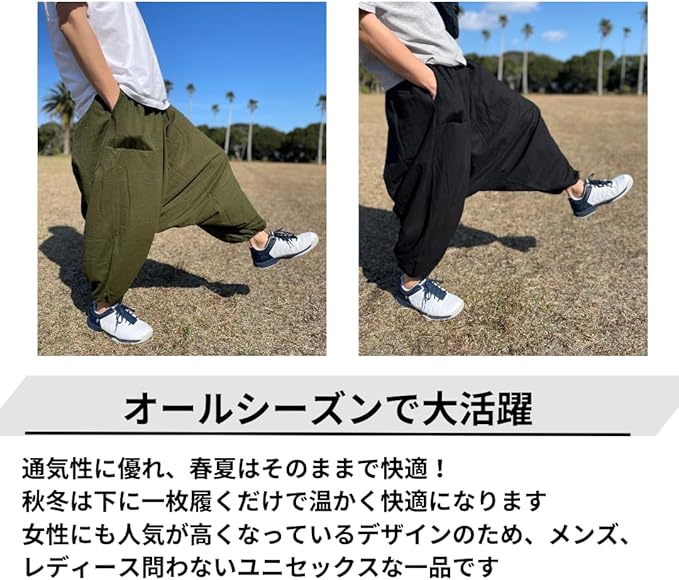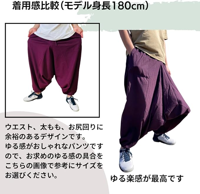 【快適なフィット感で動きやすさ抜群】 深めの股上と広めのレッグスペースが、どんな姿勢でもストレスなく体を包みます。アウトドアからリラックスした室内まで、多様なシーンで自由に動けるこのサルエルパンツは、快適なフィット感であなたの一日をサポートします。