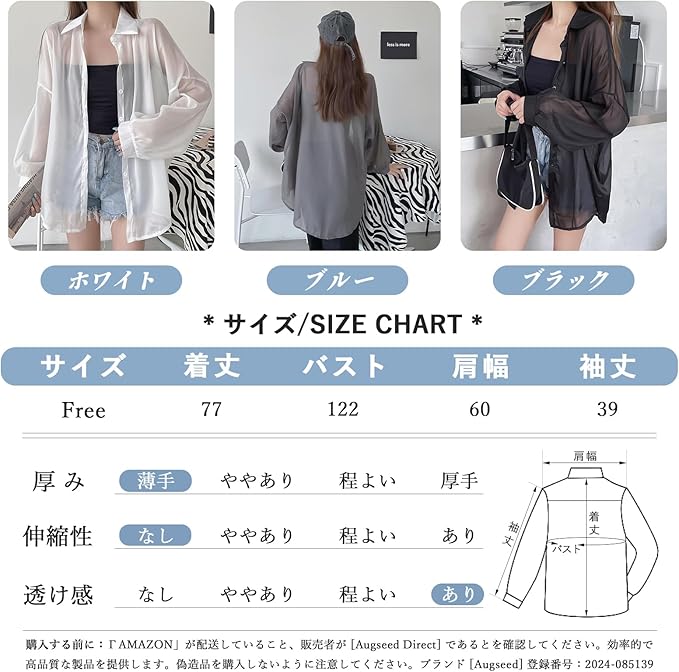 [Augseed] ラッシュガード レディース uvカット カーディガン シアー シャツ 夏 トップス 長袖 ブラウス おしゃれ 光沢 無地 大きいサイズ 冷感 透け感 シフォン オフィス カジュアル 日焼け対策 冷房対策 薄手 襟付き 羽織り | oioioichan