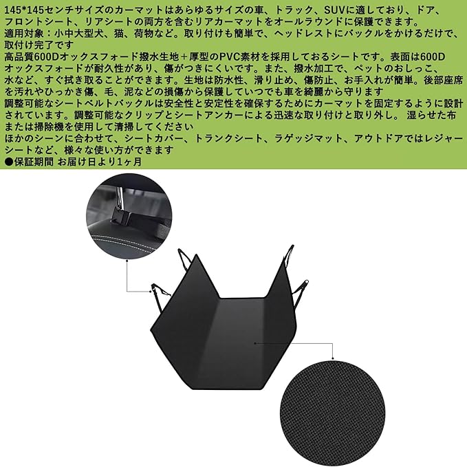 145*145センチサイズのカーマットはあらゆるサイズの車、トラック、SUVに適しており、ドア、フロントシート、リアシートの両方を含むリアカーマットをオールラウンドに保護できます。適用対象:小中大型犬、猫、荷物など。取り付けも簡単で、ヘッドレストにバックルをかけるだけで、取付け完了です