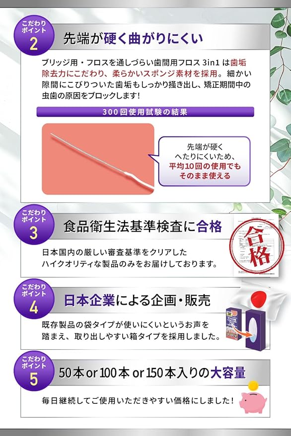 【安全性】口に入れるものである以上安全性の確認は欠かせません。この ブリッジ フロス は日本の第三者検査機関による分析検査を受け衛生法に準拠した試験を実施し「適合」のお墨付きをいただいており、どなたでも安心してお使いいただけます。