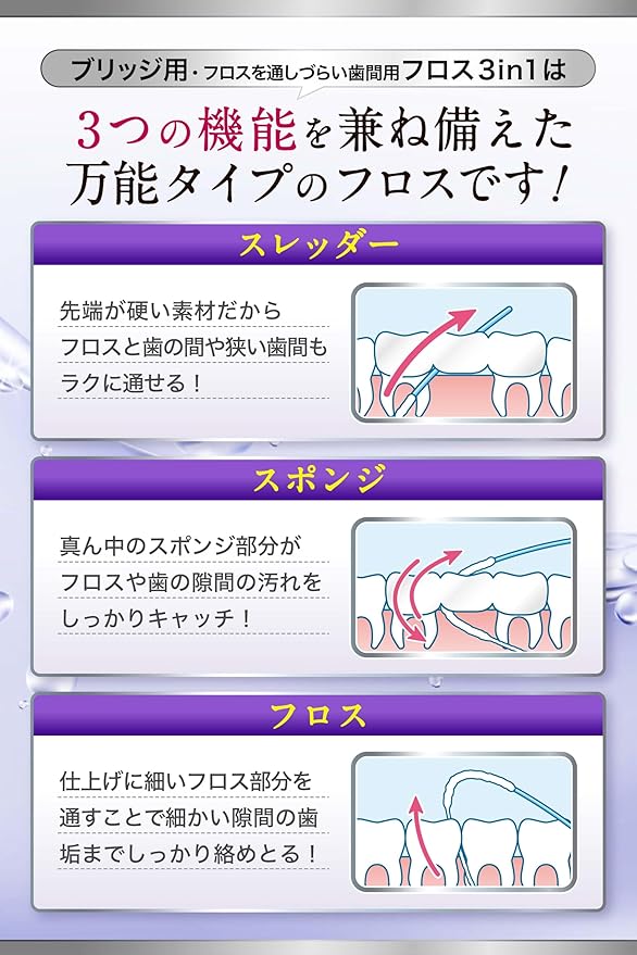 【新登場3in1タイプ】 より細かい歯間まで掃除をしたいというお客様からのご要望にお応えし、ブリッジ用フロスにフロスを付属させた3in1タイプを開発いたしました。これにより、より狭い隙間の掃除や矯正器具の間等、より幅広い用途でお使いいただけるスーパーフロスとなりました。ブリッジの方はもちろんのこと、ワイヤー矯正中や歯間にフロスを通しづらい歯並び等より幅広い用途に対応できるようになりました。