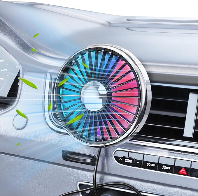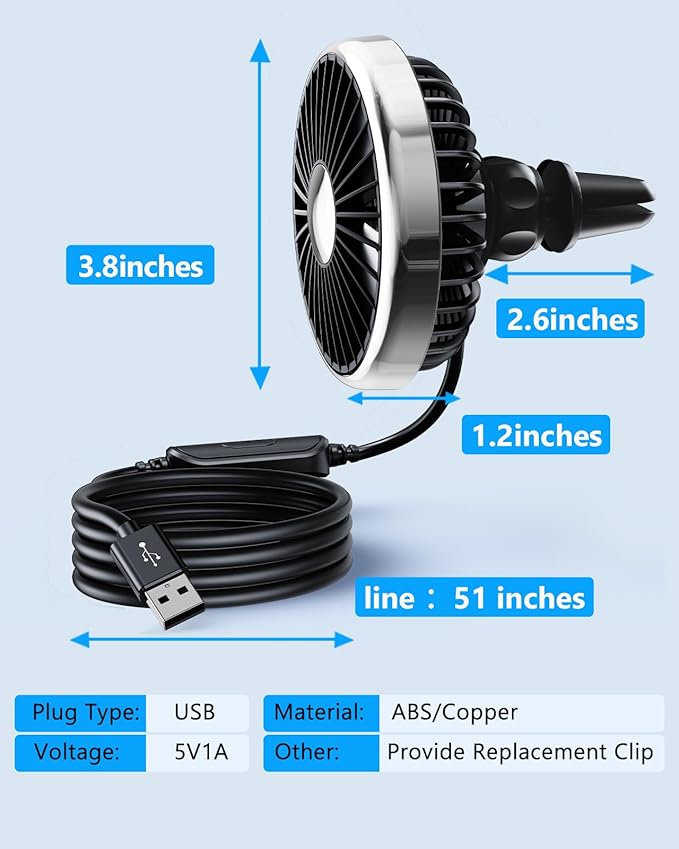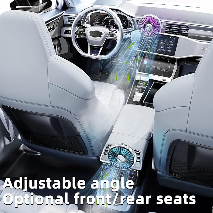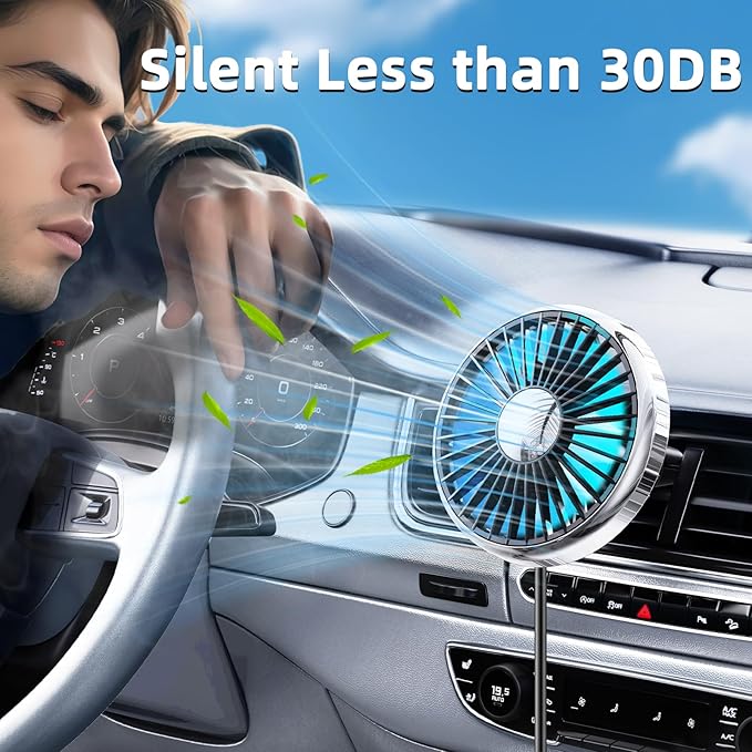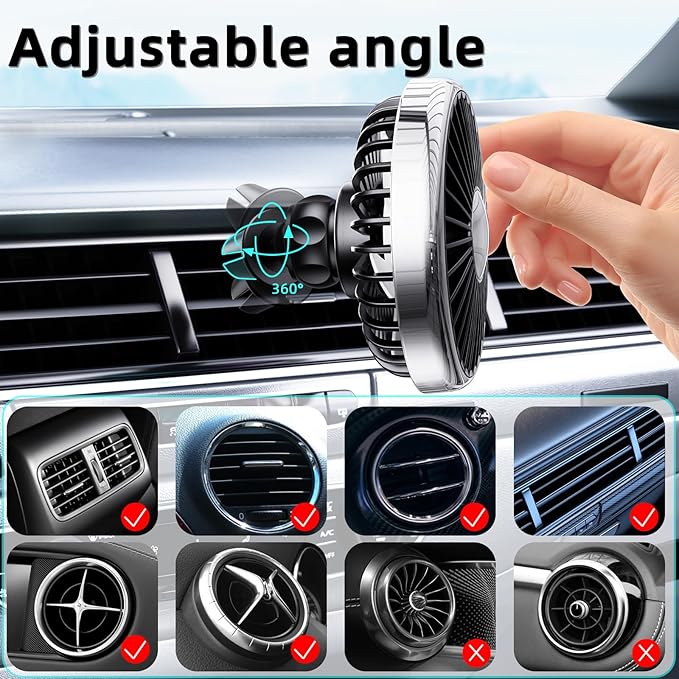【静か、エアコン吹き出し口で使用】: この車載扇風機は静かに作動し、騒音は30DBに近く、睡眠に影響を与えません。 運転手と同乗者を冷やすために、フロントベントに置いてください。 リアベントに置けば、子供やペットをクールダウンさせることができます。