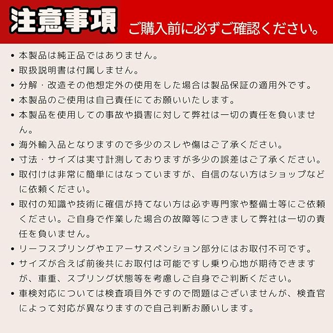 1. ショック吸収&異音解消 ショックアブソーバーで吸収しきれない振動を吸収し、スプリングの線間密着による異音も解消します。乗り心地を快適に改善。