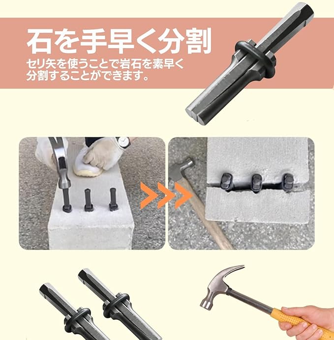 【幅広い用途で活躍】セリ矢は、岩石やコンクリートの分割に加え、鉱石採掘や道路工事、基礎工事にも最適です。庭石や景観作りの際にも使用でき、古い建物の解体時にも有効です。狭いスペースでの作業にも便利で、携帯性が高く、様々なシーンで活躍します。コンクリートブロックやレンガの加工にも適した工具です。
