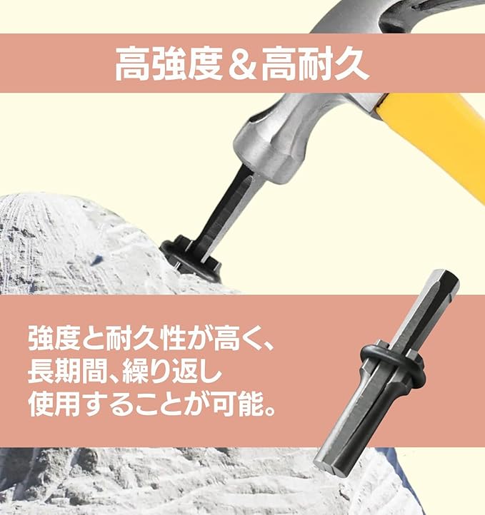 【耐久性抜群】高硬度スチール製で、錆びにくく、長期間の使用に耐える頑丈な設計です。強度と耐久性に優れ、長期間繰り返し再利用できます。コンパクトで携帯しやすく、屋外での使用にも最適。庭石や景石、コンクリート解体など、さまざまな石材やブロックの分割作業に幅広く対応します。