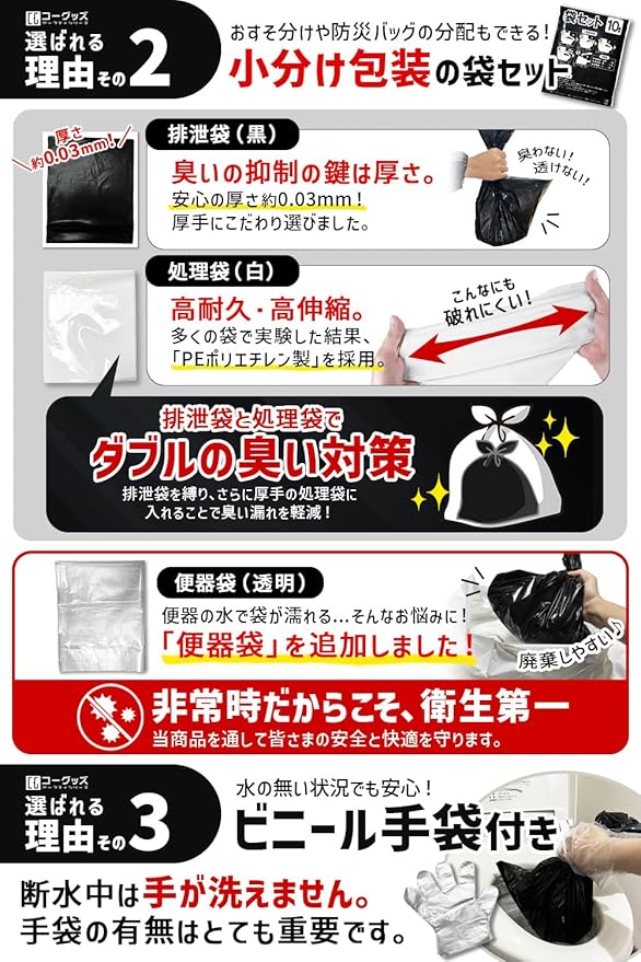【ポリ袋セットへのこだわり】POINT①便器袋:非常時だからこそ、衛生第一。処理が格段に楽になります。 POINT②排泄袋:耐久性と伸縮性が推し。様々な実験から「PEポリエチレン製」を採用。 POINT③処理袋:厚さ0.03mm(一般的には0.01mmを使用)の肉厚仕様で防臭強化。