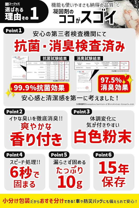 【検査機関で実証済み 高品質・こだわりの凝固剤】 POINT①99.9%抗菌効果。 POINT②97.5%消臭効果。 POINT③爽やかな香り付き。 POINT④6秒で固まる即効性。 POINT⑤たっぷり容量10g。 POINT⑥体調変化が分かりやすい白色。 POINT⑦最長15年保存。