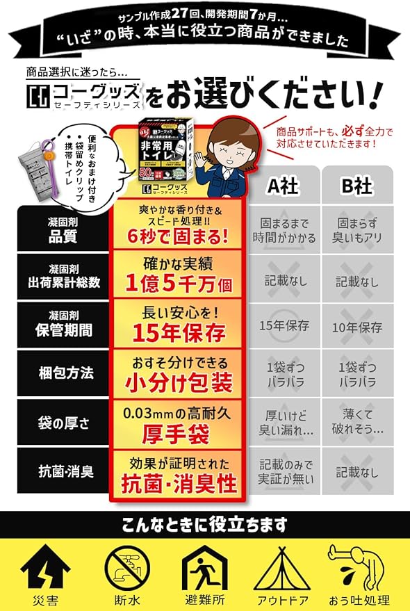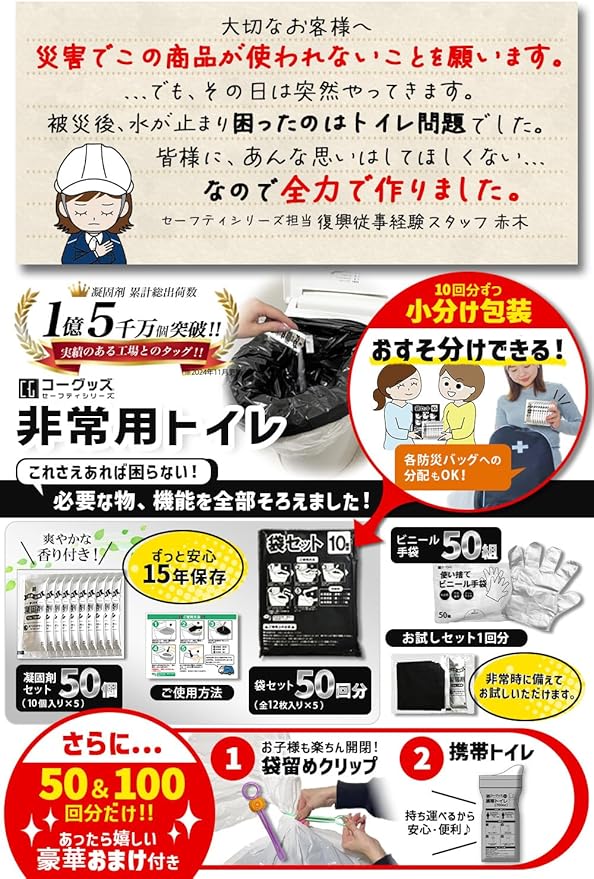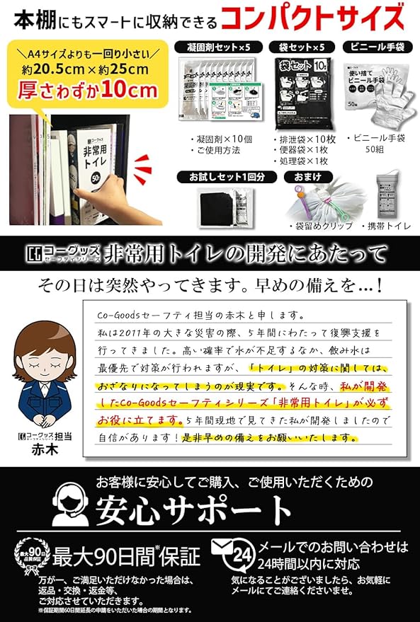【2024年11月新登場 その日は突然やってきます 早めの備えを】 Co-Coodsスタッフの赤木と申します。私は2011年の大きな災害の際、5年間にわたって復興支援を行ってきました。災害が起きると、平穏な日々の中では想像がつきにくいかもしれませんが、高い確率で水が不足します。飲み水は最優先で対策が行われますが、「トイレ」の対策に関しては、おざなりになってしまうのが現実です。そんな時、私が開発したCo-Goodsセーフティーシリーズ「 非常用トイレ 簡易トイレ 」が必ずお役に立てます。5年間現地を見てきた私が開発しましたので自信があります!是非早めの備えをお願いいたします。