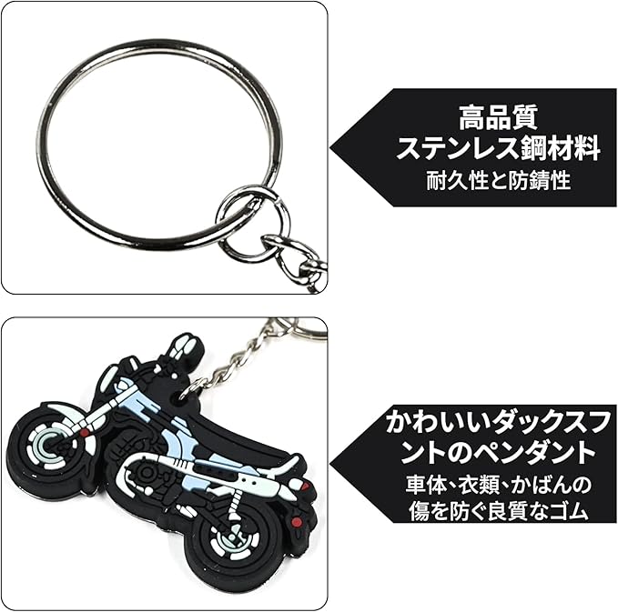 高品質材料:私たちのダックス125 バイクラバーキーホルダーは丈夫で耐久性のあるゴムストラップとステンレスキーホルダーを組み合わせたものです。ゴム素材は軽く、持ち運びに便利で、傷付き防止特性があり、日常使いに最適です。また、鍵の重さを増やすことなく、使いやすくて省力的です。