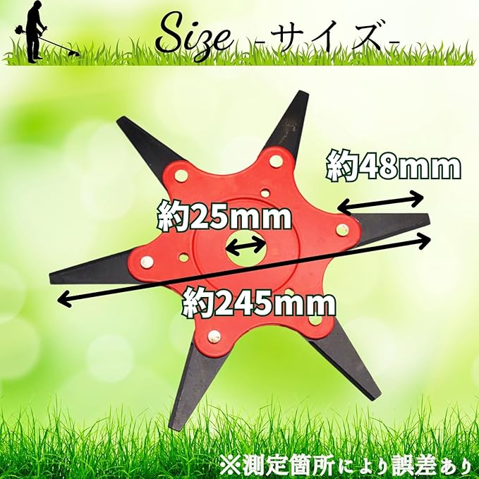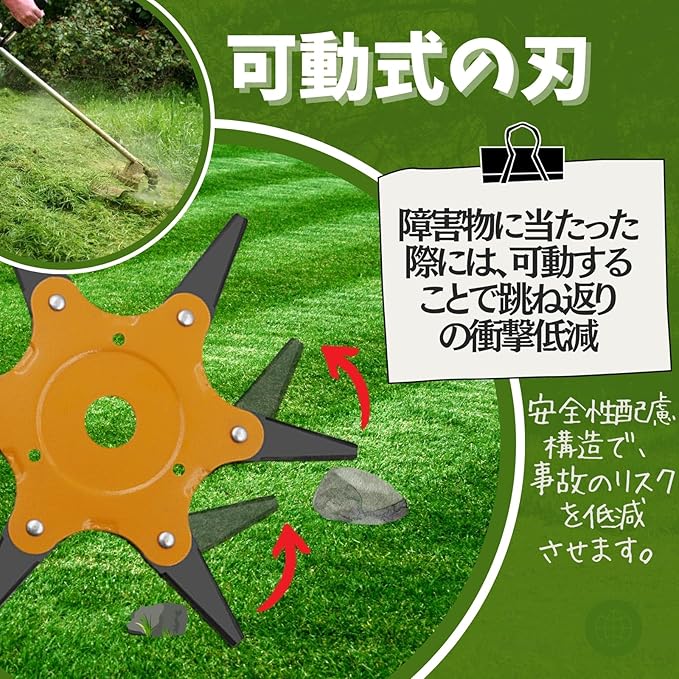 【効率的な刈り取り】6歯チップソーは、特殊な高硬度素材を使用しており、直径約245mmの広範囲をカバーし、草刈り作業を迅速かつ容易にします。約48mmの刃長で、厚い草も一瞬で刈り取ります。