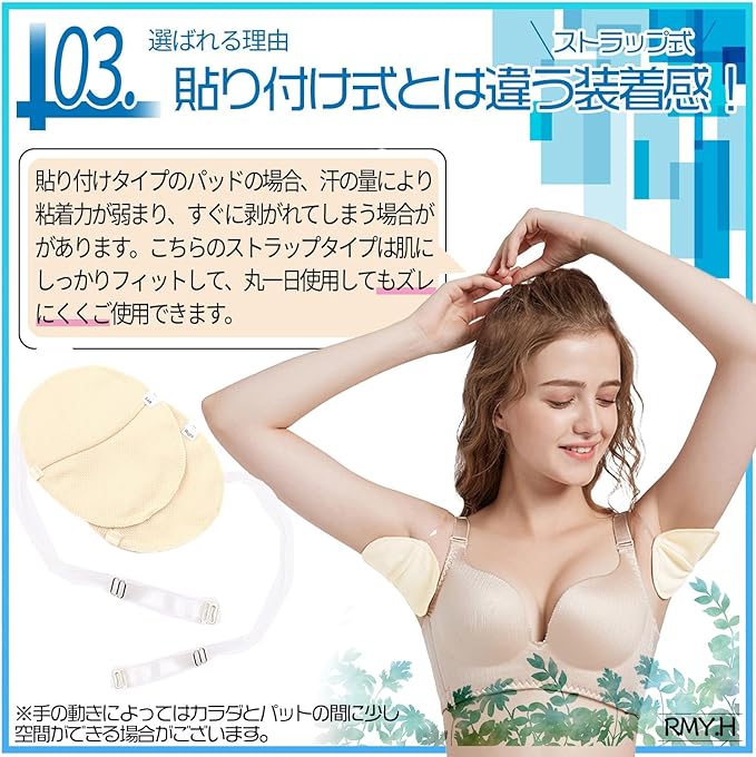 【快適!装着感】貼り付けタイプのパッドの場合、汗の量により粘着力が弱まり、すぐに剥がれてしまう場合がありますが、ストラップタイプの脇汗パッドは肌にしっかりフィットして丸一日使用してもズレることなくご使用できます。多汗の方にはとても頼もしい一品です♪