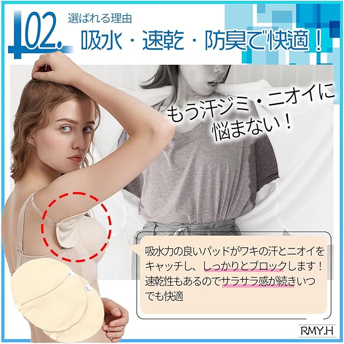 【速乾・吸収性】吸収力の良いパッドがワキの汗をニオイをキャッチし、しっかりとブロックします!速乾性にも優れサラサラ感がずーっと続き1日中快適に過ごせます♪
