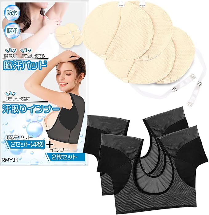 RMY.H 脇汗パッド 繰り返し使える 汗脇パッド 4枚入り プラスパッドのズレを防止するインナー2枚セット 肩に着ける あせジミ防止 汗取りパッド 洗える 脇汗 目立たない(ブラック, M) | oioioichan