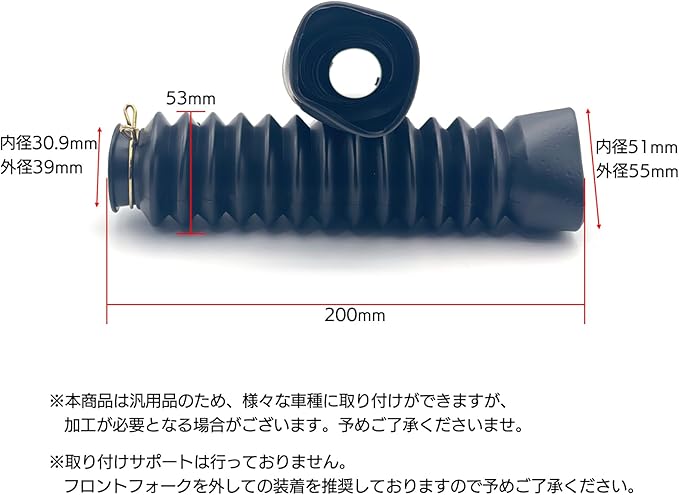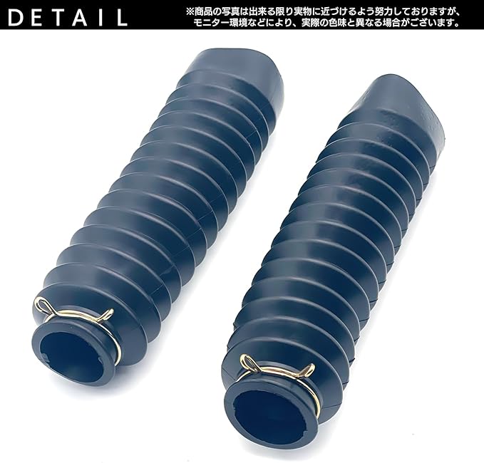 本製品は、フロントフォークを外してから装着するタイプの汎用品です。純正フォークブーツと交換するだけで、カスタムバイクのようなビジュアルに仕上げることができます。簡単な変更で大きな印象の違いを生み出せるため、手軽にカスタムを楽しみたい方に最適です。