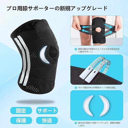 【優れた安定性】この膝パッドは両側に月形パッドにより、膝を柔らかく弾力性のある丸みを帯びて包み込み、側面のサポート力を増強し、衝撃を緩和し、膝と半月板の裂傷の不快感を和らげます。膝の皿の下に負荷パッド一つを設置し、関節をサポートし負荷を軽減し、より良い安定性を実現します。それに、金属サイドバネ(4本)を設置して、膝の曲げ伸ばしをスムーズに受け止めつつ、膝関節を支え、圧力を分散させ、膝を安定させます。