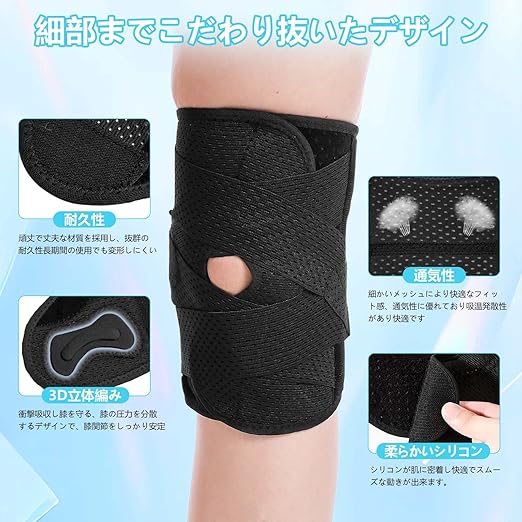 【3D立体構造・】この膝当ては立体編み技術でしっかり作り。立体編み技術で耐久性が高く、長時間に使っても毛玉と雑な糸がありません。適度な厚さは耐久性を高める一方、ベルトで調整ので、着脱安い。フィットして違和感がありません。同時にこの膝当ては背中の膝窩の弧度を延長し、膝当ての包む性を延長し、アジア人の脚のデザインにより適しています。